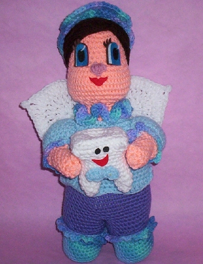 Very easy to make. Finished doll is about 15" tall. Crochet pattern includes: list of supplies needed; actual-size pattern pieces for making face and instructions for accessories.